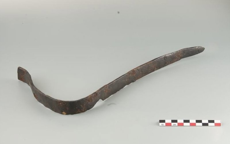 El intenso interés rodea no sólo los métodos de producción de la hoja, sino cómo llegó a ser enterrada. El sable estaba roto, su mango perdido, y la hoja torcida. El análisis muestra microfisuras presentes en la hoja, por lo general una indicación de que un objeto había sido quemado. Lo más probable es que el arma se sometiera a la flexión como daño ritual, para lo que la hoja tuvo que ser calentada a una temperatura alta.