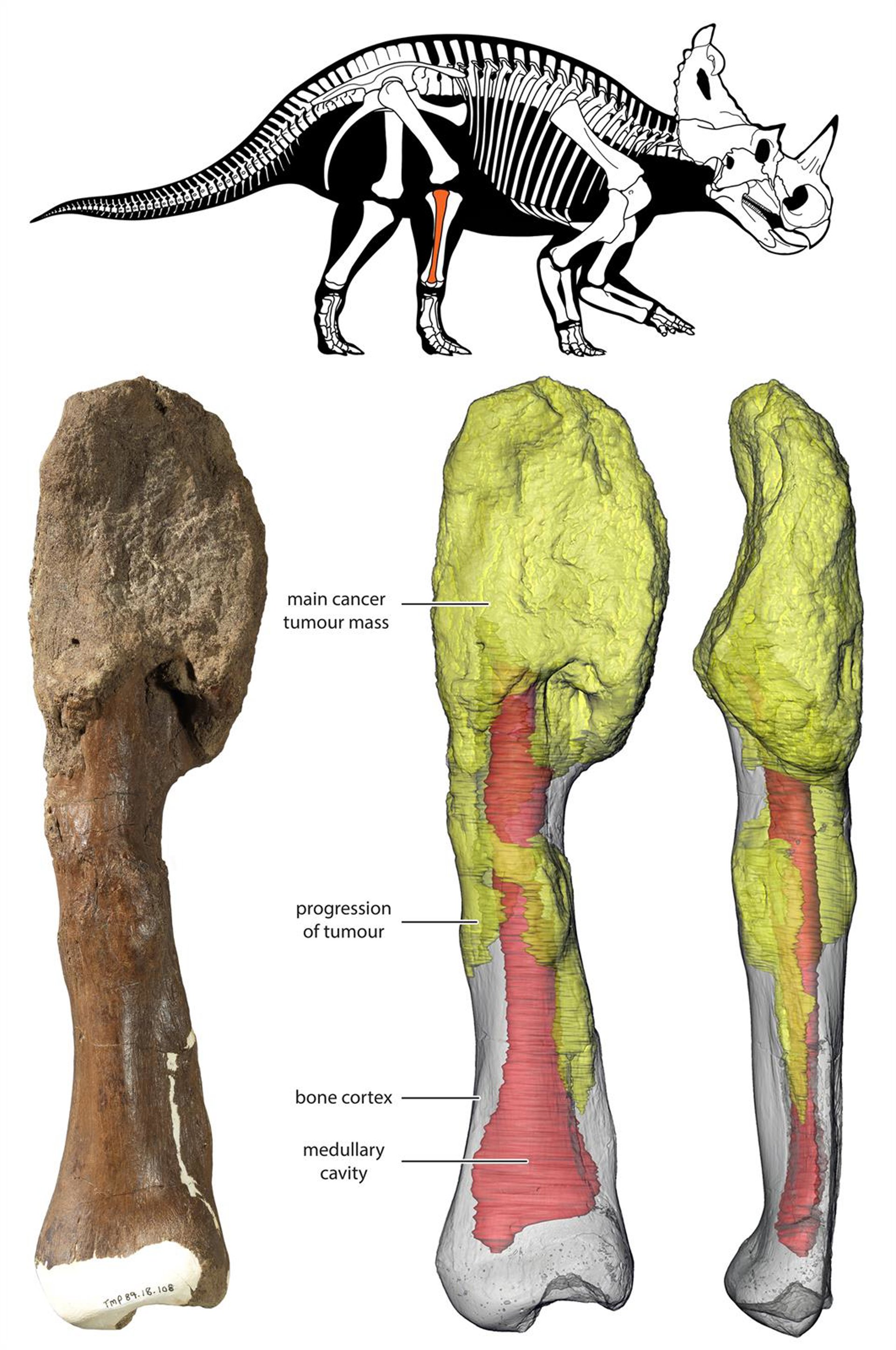 El hueso canceroso en cuestión es el peroné de un 'Centrosaurus apertus', un dinosaurio con cuernos que vivió hace entre 76 y 77 millones de años. Descubierto originalmente en el Dinosaur Provincial Park de Alberta en 1989, se pensó originalmente que el extremo malformado del fósil representaba una fractura curativa.