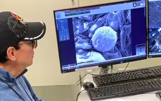 Un microscopio electrónico de barrido se usó en el Centro de Caracterización de Materiales Avanzados de la UC para estudiar microesférulas ricas en hierro y silicio recolectadas en sitios antiguos de Hopewell - LARRY SANDMAN