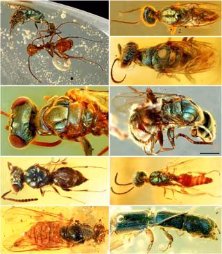 El raro conjunto de fósiles ámbar incluye avispas cuco con colores metálicos de color verde azulado, verde amarillento, azul púrpura o verde en la cabeza, el tórax, el abdomen y las patas. En términos de color, son casi lo mismo que las avispas cuco que viven hoy", señala el doctor Cai.