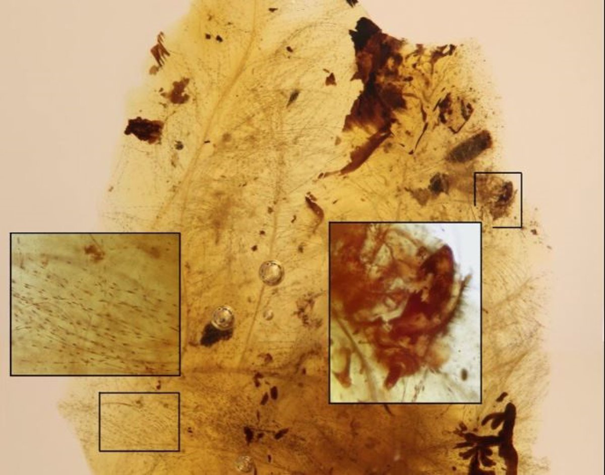 Los principales fragmentos de ámbar estudiados, de la localidad de San Just (Teruel), contienen mudas larvales de pequeñas larvas de escarabajos estrechamente rodeadas por porciones de plumas suaves, según los investigadores, que publican resultados en PNAS.