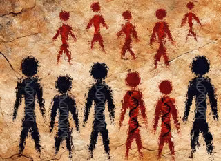 Ilustración de un encuentro entre un grupo de neandertales y un grupo de humanos modernos con descendencia (rojo, fila inferior) que muestra una ascendencia neandertal reciente, imaginada como una pintura de arte rupestre. - LEONARDO IASI, MPI-EVA.