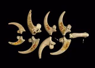 Cuatro de esas garras presentan varias marcas de corte suavizando el borde y ocho muestran caras pulidas. Tres de las garras más grandes poseen pequeñas muescas al menos en el mismo lugar a lo largo de la superficie plantar, según han visto los investigadores. Los autores sugieren que estas características pueden ser parte de la construcción de joyas, como el ensamblaje de las garras para un collar o una pulsera.