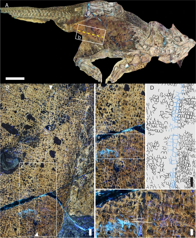 El doctor Michael Pittman, profesor asistente de la Facultad de Ciencias de la Vida de CUHK (Universidad China de Hong Kong) aplicó la técnica de fluorescencia estimulada por láser (LSF) a un espécimen de piel fosilizada de Psittacosaurus, un animal de dos metros de largo y dos patas comedor de plantas vivió en China durante el período Cretácico.