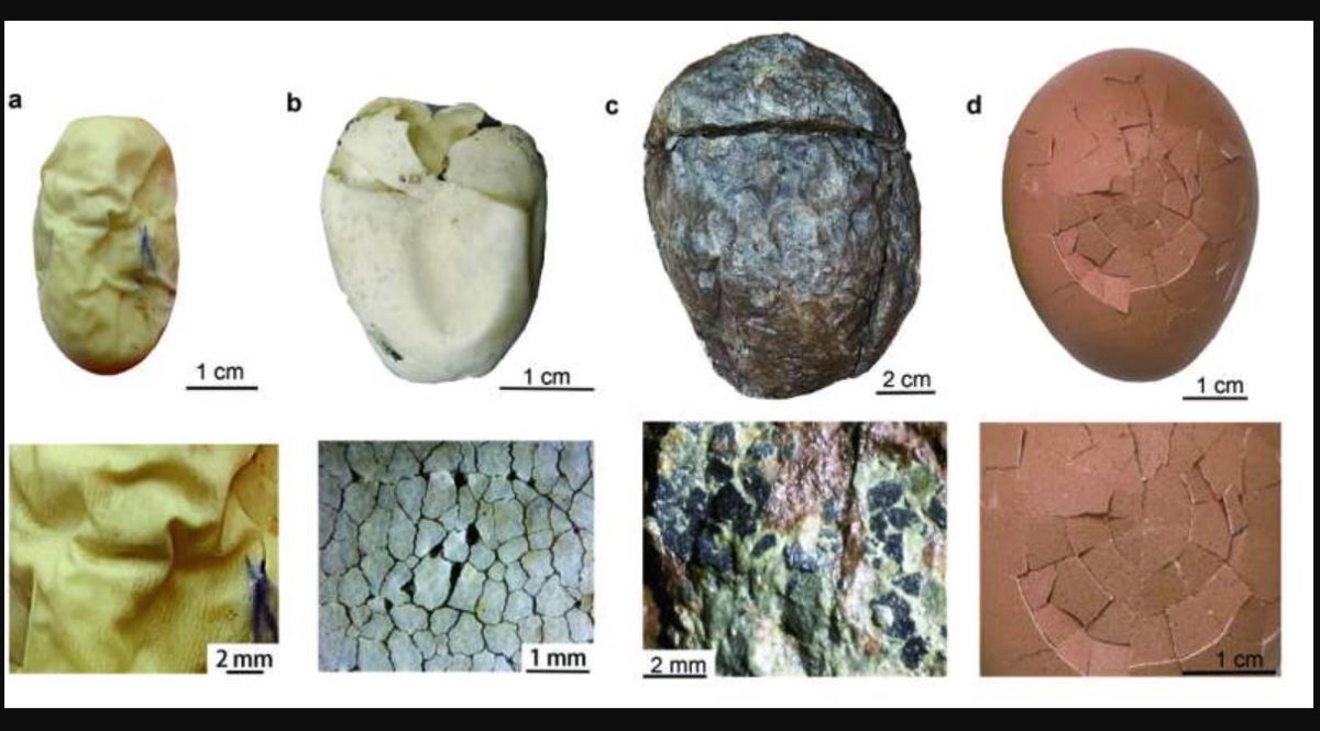 Comparación de huevos fósiles (c) con huevos existentes de cáscara blanda, áspera y dura. - IVPP