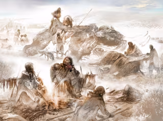 Una reconstrucción artística de la vida de los Clovis hace 13.000 años muestra al infante Anzick-1 con su madre consumiendo carne de mamut cerca de un hogar. - ERIC CARLSON/ BEN POTTER (UAF)/ JIM CHATTERS