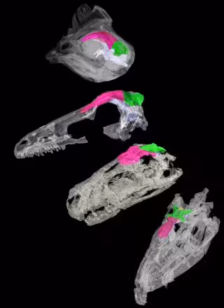 "Encontramos una clara relación entre los huesos frontales y el prosencéfalo y los huesos parietales y mesencéfalo", afirma Bhullar. Los investigadores, entre ellos el autor principal, Matteo Fabbri, estudiante graduado en el laboratorio de Bhullar, confirmaron este hallazgo observando embriones de lagartos, caimanes y aves usando una nueva técnica de tomografía computarizada contrastada.