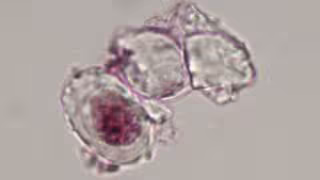 Además, el equipo aisló algunas células y las tiñó con una sustancia química utilizada en laboratorios biológicos de todo el mundo. Se sabe que esta sustancia química púrpura, llamada hematoxilina, se une a los núcleos de las células. Después de teñir el material de dinosaurio, una célula de dinosaurio mostró un núcleo morado con algunos hilos morados más oscuros. Esto significa que la célula de dinosaurio de 125 millones de años tiene un núcleo tan bien conservado que conserva algunas biomoléculas e hilos de cromatina originales.