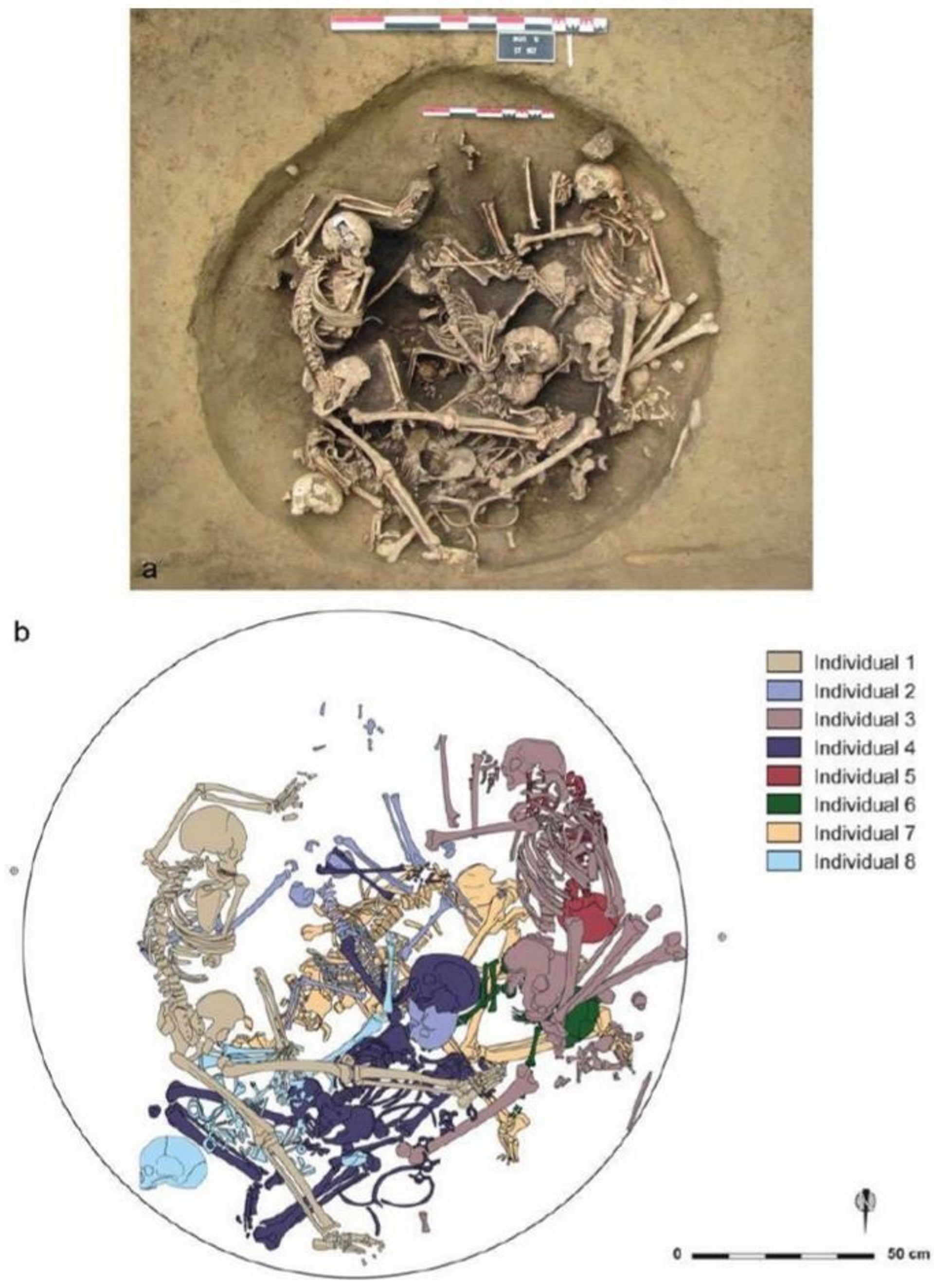 La condición de los esqueletos, sugiere el equipo, indica que los huesos pertenecieron a personas que murieron en algún tipo de guerra, ya que había daños que parecían infligidos por hachas. Los exámenes de los huesos indican que eran todos de un período de entre hace 5.500 y 6.500 años, poniéndolos en el Neolítico. Una capa de sedimento estaba en la cima de los esqueletos y encima estaba el esqueleto de otra mujer, cuyo cuerpo había sido claramente puesto allí mucho después de los huesos de debajo.