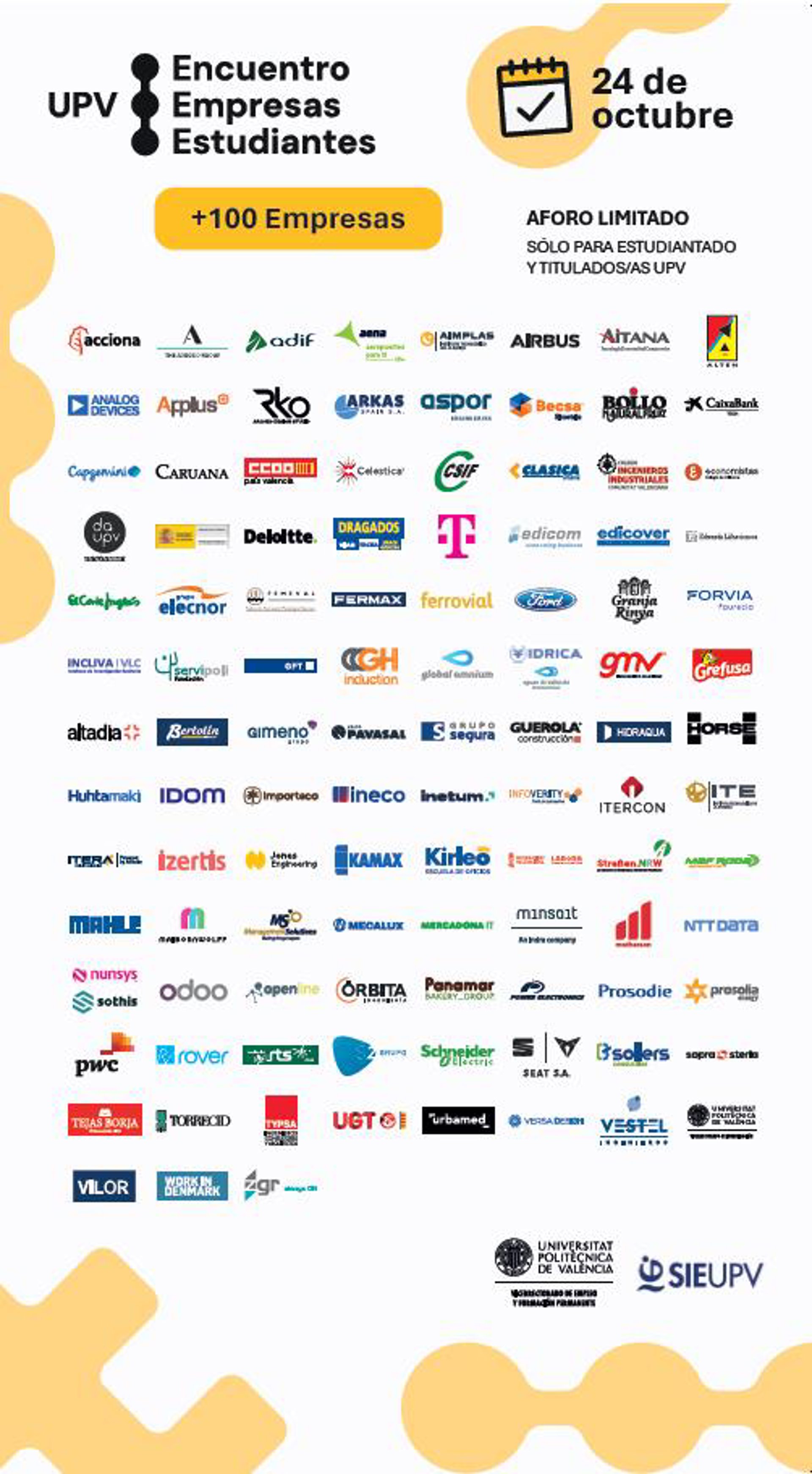 Las empresas participantes en este encuentro son: Acciona, The Adecco Group, Adif, Aena, Aimplas, Airbus, Aitana, Alten, Analog Devices, Applus, Arched Design Studio, Arkas Spain, Aspor Engineering, Becsa Simetría, Bollo Natural Fruit, Caixabank Tech, Capgemini, Caruana, CCOO País Valenci, Celestica, Csif, Clásica Urbana, Colegio Ingenieros Industriales Comunitat Valenciana, Colegio de Economistas de Valencia, Delegación de Alumnos UPV, Ministerio de Defensa, Deloitte, Dragados, T, Edicom, Edicover, Edwards Lifesciences, El Corte Inglés, Grupo Elecnor, Femeval, Fermax, Ferrovial, Ford, Granja Rinya, Forvia Faurecia, Incliva VLC, Servipoli, GFT, GH Group Induction, Global Omnium, Idrica, Gmv, Grefusa, Altadia, Grupo Bertolín, Grupo Gimeno, Grupo Pavasal, Grupo Segura, Guerola Construcción, Hidraqua, Horse, Huhtamaki, Idom, Importaco, Ineco, Intetum, Infoverity, Intercon, Instituto Tecnológico de la Energía, Itera, Izertis, Jones Engineering, Kamax, Kirleo, Labora Generalitat Valenciana, Straben.NRW, Maf Roda, Mahle, Maibornwolff, Management Solutions, Mecalux, Mercadona IT, Minsait, Motherson, NTT Data, Nunsys, Sothis, Odoo, Openline, Órbita Ingeniería, Panamar Bakery Group, Power Electronics, Prosodie, Prosolia Energy, PwC, Rover, Rts, S2Grupo, Schneider Electric, Seat, Sollers Consulting, Sopra Steria, Tejas Borja, Torrecid, Typsa, UGT, Urbamed, Versa Design, Vestel Ingenieros, Vicerrectorado de Investigación de la Universitat Politécnica de Valncia, Vilor, Work in Denmark, Gr Always On.