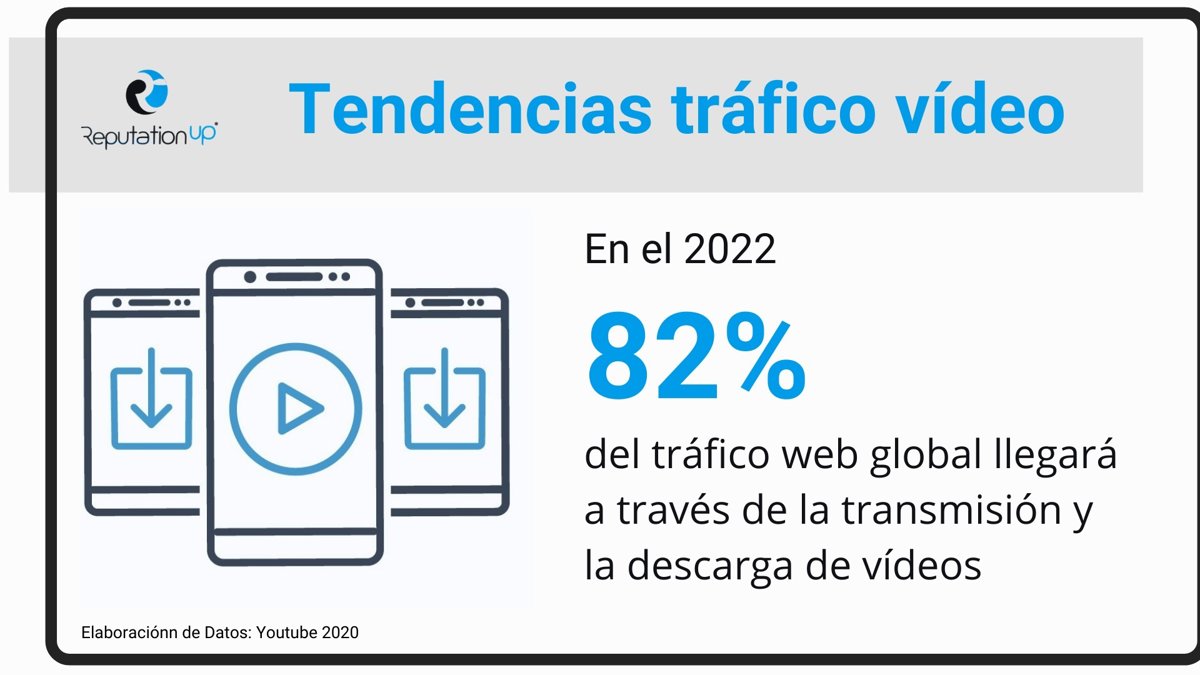 El análisis del Centro de Estudios de ReputationUP, en tendencias del tráfico para el 2022, identifica que el 82% de todo el tráfico web, vendrá de la visualización y la descarga (difusión) de vídeos.