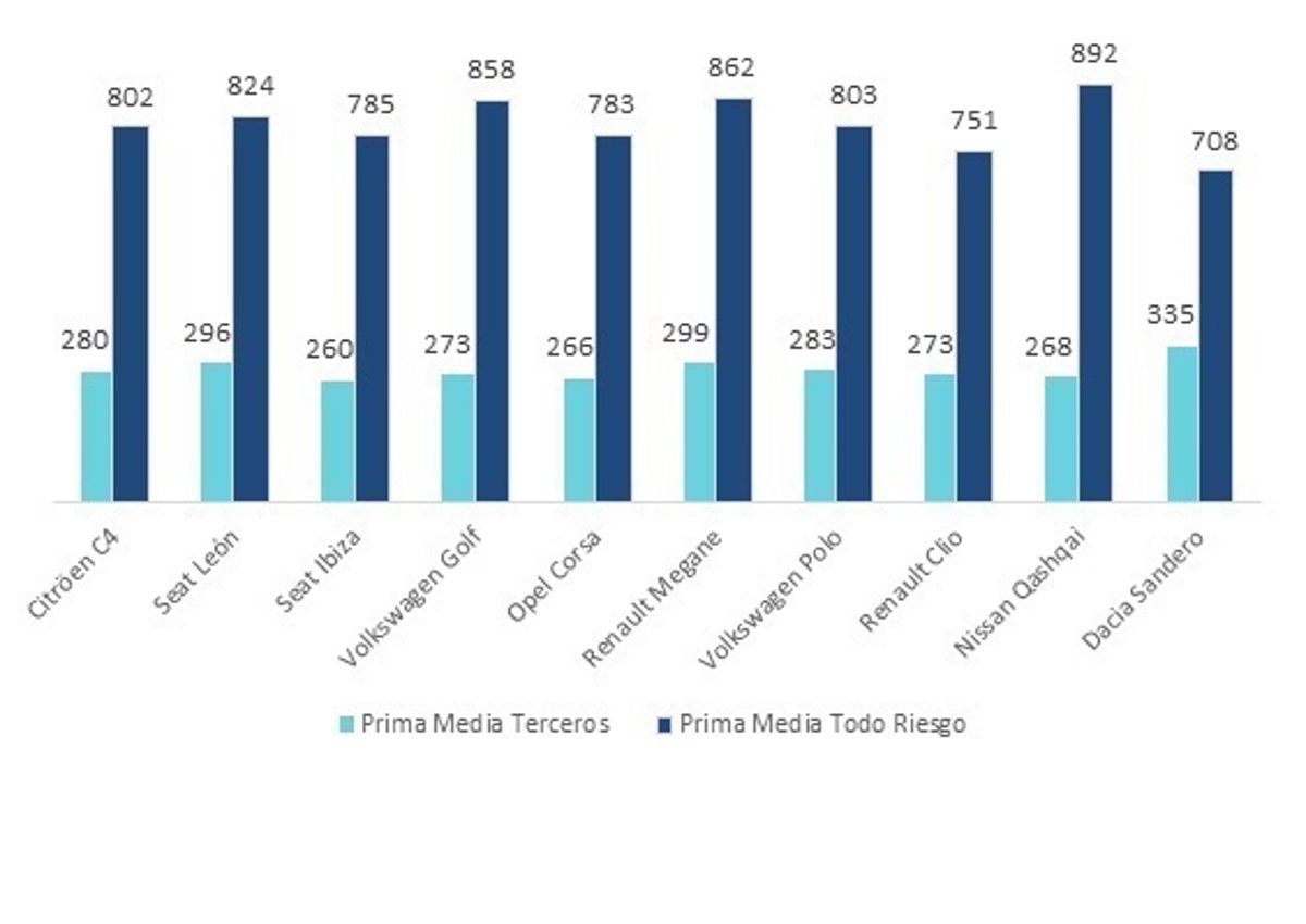 · El Seat Ibiza es el modelo del ranking con la prima media de seguro a Terceros más baja (260€), en contraposición al Dacia Sandero (335€) que presenta la prima más elevada de esta modalidad. Sin embargo, este modelo de Dacia ostenta a su vez la prima media más barata para Todo Riesgo (708€), frente al Nissan Qashqai cuya prima media a Todo Riesgo es la más cara (892€).