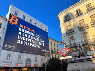 Bit2Me, empresa española que ofrece servicios financieros tecnológicos basados en criptomonedas, ha desplegado una espectacular lona de 23 metros por 15 metros en la Puerta del Sol con la leyenda Bitcoin: bienvenido a la república independiente de tu pasta.