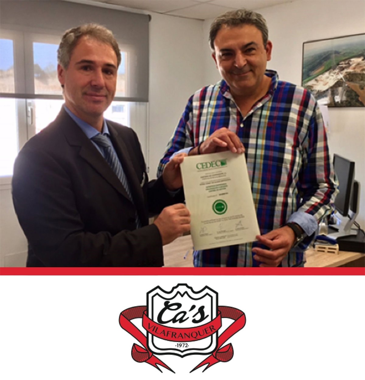 En la actualidad, CAS VILAFRANQUER, S.L. afronta su futuro con las máximas garantías de éxito. La empresa ha obtenido recientemente el certificado de CUMPLIMIENTO DE LA NORMA CEDEC DE CALIDAD EMPRESARIAL en las área de Estrategia Empresarial, Organización Funcional y Control de Gestión, otorgado tras la intervención y nueva evaluación a cargo de la consultora de organización estratégica para empresas familiares CEDEC.