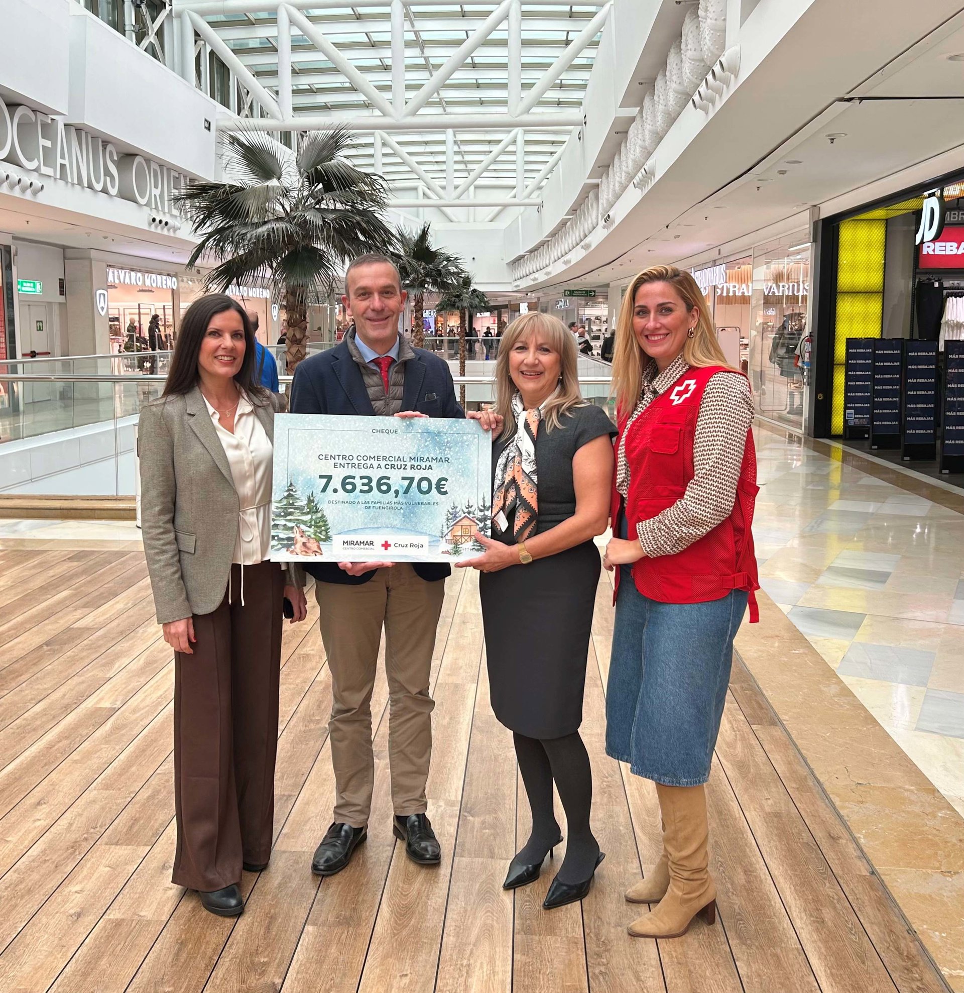 El centro comercial Miramar ha realizado la entrega oficial del cheque solidario a Cruz Roja, resultado de la recaudación obtenida en el stand de envoltorio de regalos solidario durante la pasada campaña de Navidad. Gracias a la colaboración de los visitantes, empleados y una aportación adicional de 2.000 euros por parte de Miramar, el importe total del donativo asciende a 7.636,70 euros.