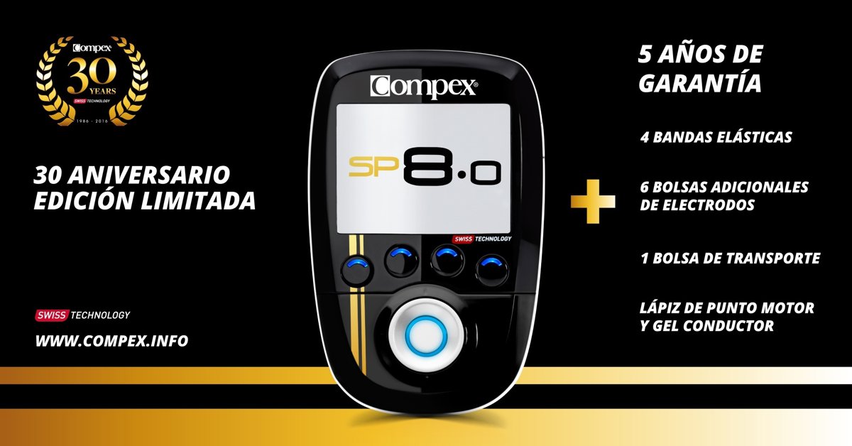 Para celebrar su 30 aniversario, Compex lanza el modelo de edición limitada Compex SP8.0 Gold Edition, que contará con 5 años de garantía y todos los accesorios que harán para el usuario de la electroestimulación una experiencia única, ofreciendo un sinfín de beneficios y mejoras. Hace ya 30 años que la marca suiza lanzaba al mercado los primeros dispositivos médicos que a día de hoy son un referente en el mundo de la electroestimulación. Son siete los momentos que han marcado la historia de la marca de referencia internacional en el mundo de la electroestimulación, que comenzó en el año 1986 con la creación de su primer dispositivo dedicado al sector médico. Gracias a esta historia, deportistas de la talla de Mario Mola, Kilian Jornet e integrantes del equipo MMR Bikes (Carlos Coloma, Catriel Soto, Pablo Rodríguez y David Valero) entre otros, se presentan como fieles usuarios de Compex. “Solución, portátil y funcional” son algunos de los adjetivos que identifican a la marca de referencia Suiza". Y es que Compex ha sabido evolucionar avanzándose a las necesidades de sus usuarios. Gracias a su departamento de I+D, hoy muestra los 7 puntos claves que han marcado la historia de la marca hasta llegar a los novedosos dispositivos wireless que ofrecen al usuario una experiencia exclusiva ayudándole a mejorar en sus entrenamientos, recuperación y prevención de lesiones, entre otros beneficios destacados. Así es COMPEX, una marca pionera que cuenta con una tecnología única avalada por 30 años de experiencia en el Mercado Siempre en vanguardia, Compex ha escuchando al usuario y avanzándose a las necesidades del mercado, ofrece a día de hoy modelos únicos con una tecnología novedosa. Además, sólo por adquirir este modelo se podrá participar en el sorteo de una tarjeta regalo El Corte Inglés por el valor del importe del Compex SP8.0 Gold Edition. Toda la Información: www.compex.info/30birthday/contest