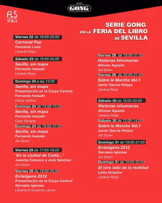 Serie Gong, a punto de cumplir un año de vida y tras su participación en las pasadas Feria del Libro de Madrid y Valencia, avanza con velocidad de crucero y potencia su buena trayectoria con la presencia de ocho de sus autores en La Feria del Libro de Sevilla, del 22 al 31 de octubre.