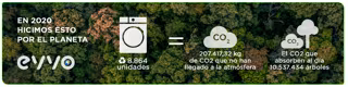 EVVO está adherida a diferentes fundaciones y organizaciones sin ánimo de lucro, que tienen la misión de preservar el medio ambiente y promover prácticas responsables dentro de la normativa legal. El pasado año, gracias a la colaboración existente entre EVVO y ECOLEC, entidad que representa al sector de fabricantes y grandes importadores de electrodomésticos, y ejemplar en la gestión de los residuos de aparatos eléctricos y electrónicos, EVVO recicló más de 434 toneladas entre gama blanca y PAE (pequeños aparatos electrodomésticos). Esta cantidad equivaldría a 207.417,32 kg de CO2 que no han llegado a la atmósfera y al C02 que absorbe, al día, el siguiente número de árboles: 10.537.434,56*. El objetivo de este año es superar las 500 toneladas.