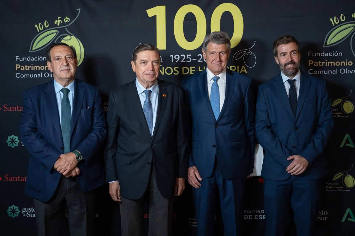 El ministro de Agricultura, Pesca y Alimentación, Luis Planas, el presidente de la Fundación Patrimonio Comunal Olivarero, Rafael Sánchez de Puerta, su vicepresidente primero, Pedro Barato y director gerente Iñaki Benito, en el acto del Centenario - Fundación Patrimonio Comunal Olivarero (FPCO)