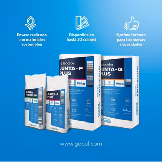• G#color Junta-G PLUS: junta de colocación, flexible desarrollada para el relleno de juntas anchas, de 3 a 15 mm. Disponible en sacos de 15 kg.