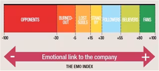 Frente a una clasificación tradicional de los clientes en promotores o detractores, la segmentación emocional de los clientes establece ocho grandes estados resumen en función de su Emo Index*: Fans, Believers, Followers, Stand By, Lost Souls, Burned-Out, Opponents y Amoebas. Además permite conocer cuáles son los disparadores que generan estas emociones en el cliente y determinan sus comportamientos (repetición, defensa, fidelidad, vinculación con la marca, etc).