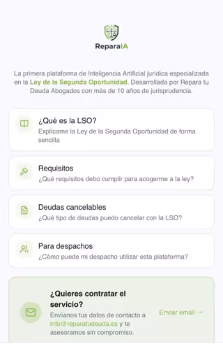 Esto no es IA genérica. Esto es IA entrenada con la experiencia del despacho pionero en España en la Ley de la Segunda Oportunidad, materializada en REPARA IA.