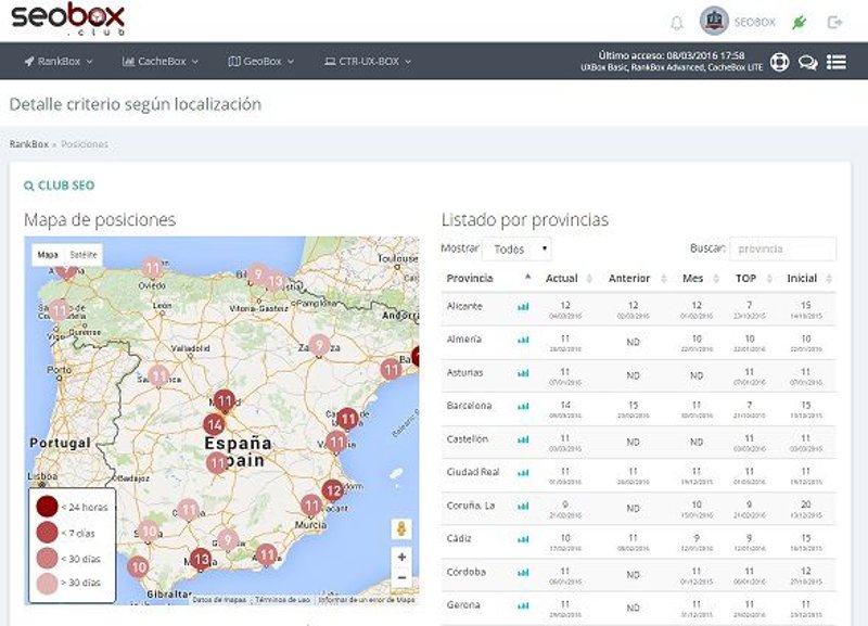 Uno de estos módulos disponibles es Rankbox, cuya misión es controlar las posiciones alcanzadas en Google por aquellas palabras clave que aportan tráfico en todo proyecto web. Su velocidad - en menos de 5 minutos analiza hasta 1000 keywords -, exactitud - las consultas salen de IPs españolas distribuidas por todo el país -, claridad en la exposición de la información y su económico precio con cuotas mensuales desde 15 a 35 euros han contribuido al crecimiento de una red de usuarios en continua expansión.