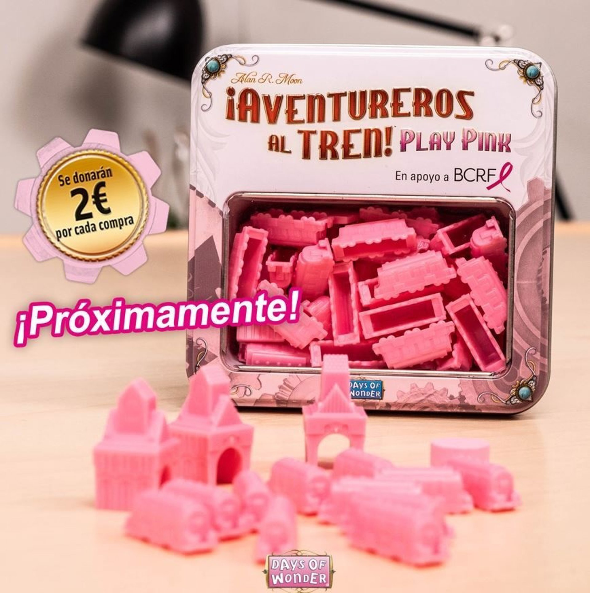 El otro juego que presenta la editora es un proyecto con fines benéficos: ¡Aventureros al Tren! Play Pink. Esta versión tiene como misión recaudar fondos para apoyar la investigación contra el cáncer de mama en todo el mundo. Para llevar a cabo este proyecto, Asmodee ha cerrado un acuerdo mundial con la Fundación para la Investigación del Cáncer de Mama (BCRF), una organización sin ánimo de lucro comprometida con la prevención y cura de este. Su lanzamiento se hará oficial en octubre, mes que coincide con el Día Internacional contra el Cáncer de Mama.