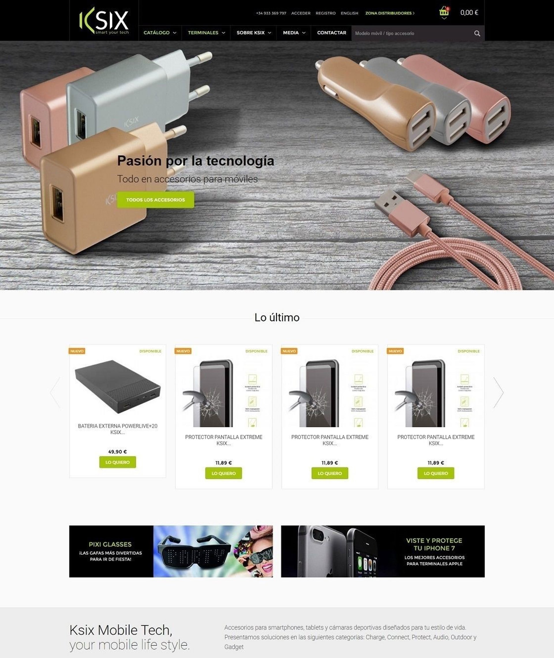 El amplio catálogo de Ksix proporciona soluciones en las siguientes categorías: Charge, Connect, Protect, Audio, Outdoor, Gadgets y Ebotics. En ellas se encuentran accesorios como baterías externas, cables de carga y datos, pulseras de actividad física, relojes Smart Watch, fundas, carcasas, protectores de pantalla de vidrio templado 9H para móviles, auriculares, artículos para cámaras deportivas, actividades outdoor y protección sumergible, entre muchos otros.