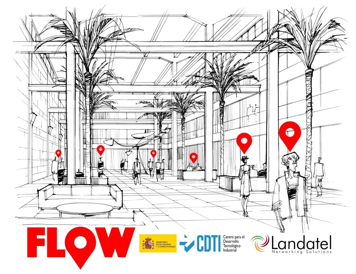 FLOW es una plataforma tecnológica desarrollada por Landatel con la colaboración de la Universidad y con financiación de CDTI, que permite monitorizar la afluencia de usuarios aportando información útil para elaborar estrategias de negocio. Entre otras cosas, permite conocer cuánta gente concurre en un espacio, el tiempo de permanencia y el flujo de movimientos dentro de un recinto, mostrando en un mapa de comportamiento la interacción del visitante con ese lugar.
