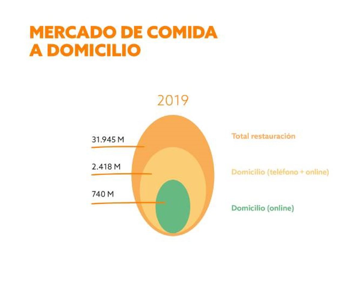 Según un análisis interno de Just Eat, el mercado de la comida a domicilio aportó 2.418 millones de euros a la economía española en 2019, de los cuales 740 corresponden a los pedidos online.