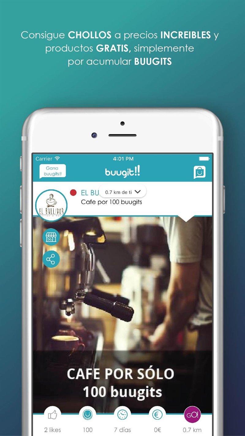 Buugit!! Se presenta como arma del comercio local para defender su modelo de proximidad. Su filosofía es no vender online pero si provocar que el consumidor online vuelva a entrar por la puerta del comercio. La magia recae en premiar a los usuarios acumulando Buugits de forma gratuita, por el mero hecho de disfrutar e interactuar con la aplicación, visualizando ofertas, compartiéndolas, valorándolas, etc... Estos emprendedores parecen haberse anticipado a la tendencia actual tras 2 años de desarrollo para el nacimiento de Buugit, ya que actualmente ciudades como Santa Coloma de Gramanet, Barcelona o Sevilla se plantean la moneda virtual como herramienta para revitalizar el comercio local. Como apoyo al cliente, el programa dispone de un geolocalizador que informa de las tiendas más cercanas respecto a su ubicación y de sus ofertas. Una vez en el comercio, la transacción es sencilla. A través de un sistema de escáner y de lectura QR's se realiza el canje automático de los 'buugits' entre usuarios y el negocio. 'Existen muchos tipos de ofertas. Por ejemplo, desde una zapatería que vende un par de zapatos por 30€ más 2.000 'buugits' o un centro de estetica que ofrece una sesión de Chocolaterapia Facial por solo 300 buugits y 0€.' Este proyecto, por tanto, ofrece al usuario una 'manera diferente de obtener descuentos o promociones en los comercios.' Para el establecimiento, es una fórmula alternativa de hacer publicidad. Además, para los comercios que se descarguen la aplicación hay algo que les puede gustar mucho.