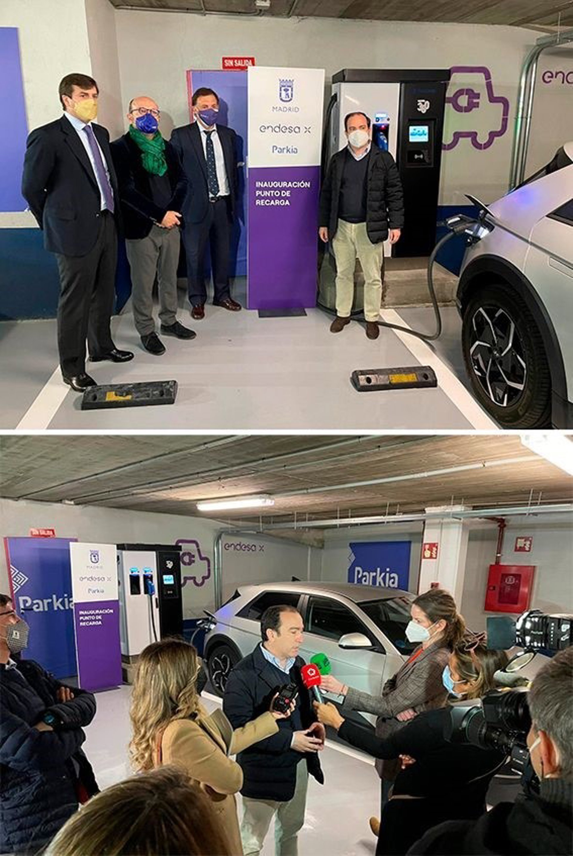 El delegado de medio ambiente del Ayuntamiento de Madrid, Borja Caravante, ha visitado la instalación que Parkia y Endesa X han puesto en marcha en el aparcamiento Parkia San Cayetano Las Ventas en Madrid. Además, a la cita han acudido Manuel Muñoz, director del Plan de Infraestructura Pública de movilidad eléctrica de Endesa X, y Julio López Castillo, director general de Parkia