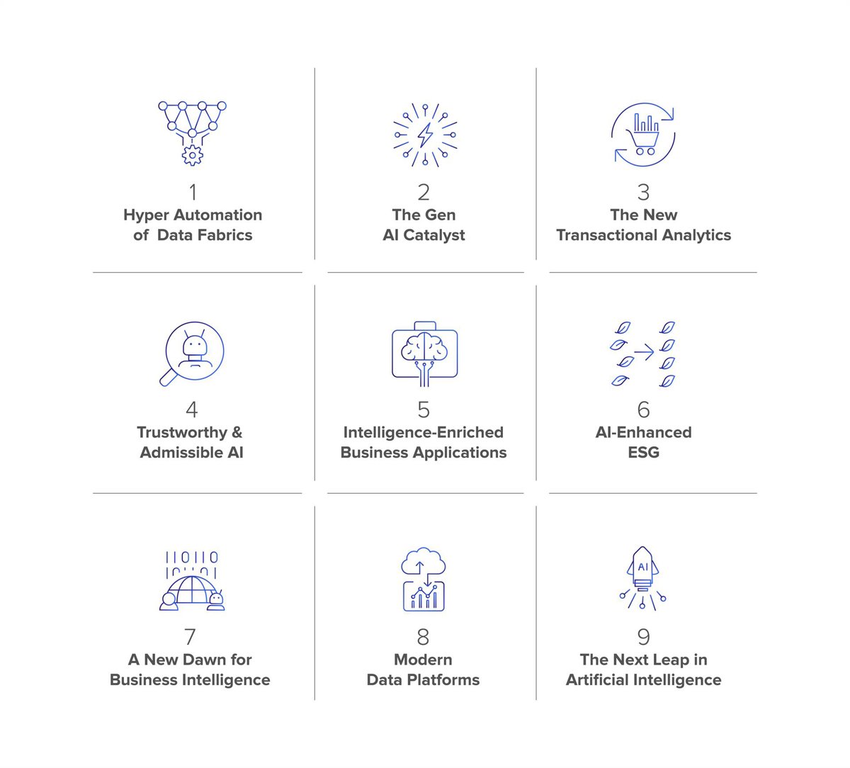 Las nueve principales tendencias en Datos, Analítica e Inteligencia Artificial mencionadas por el informe son las siguientes: