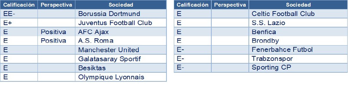 A continuación indicamos los valores del SE European Football Index y los respectivos ratings Corporate SER asignados: