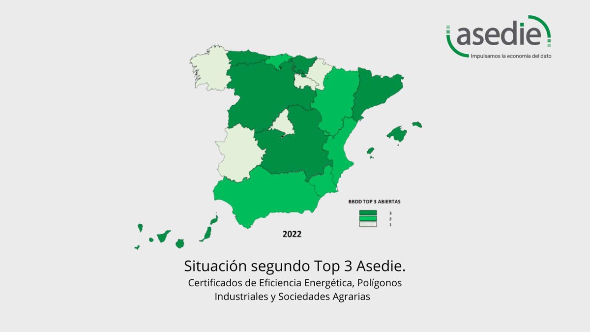 En esta segunda edición del Top 3 Asedie las bases seleccionadas han sido los registros de: Certificados de Eficiencia Energética, Polígonos Industriales y Sociedades Agrarias de Transformación. En siete Comunidades Autónomas ya se puede acceder a las tres bases de datos y hay que destacar que desde julio de este año los Certificados de Eficiencia Energéticos son accesibles en todas las autonomías y se espera completar la apertura del resto del Top 3 a lo largo de 2023.