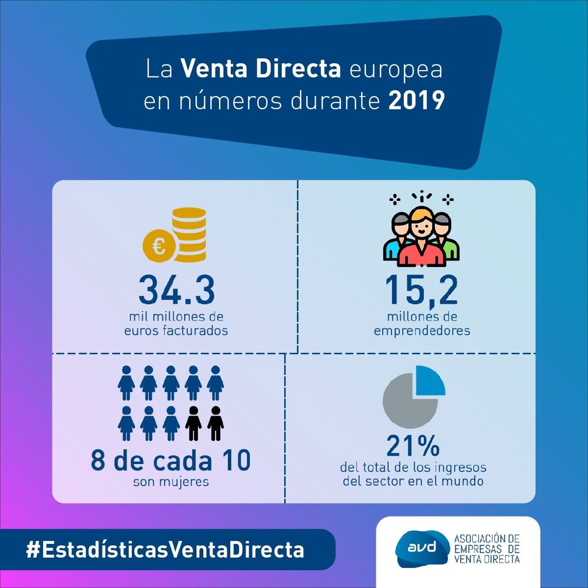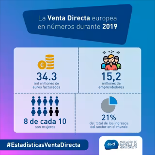 Un total de 15.2 millones de personas (6.3% más que en 2018) se dedican a la venta directa en Europa, de los cuales casi la mitad -7 millones de personas- lo hacen en países de la Unión Europea. Se estima además que ocho de cada 10 emprendedores de la venta directa en Europa son mujeres.