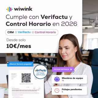 wiwink, software CRM todo en uno, simplifica el cumplimiento normativo obligatorio en 2026 para PYMES y autónomos que incorpora facturación electrónica adaptada a los requisitos técnicos de Veri*factu que junto con el módulo de control horario integrado para PYMES, ofrece una solución unificada que facilita el cumplimiento legal y la gestión total del negocio