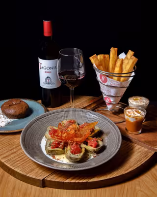 Menú Carnívoro en homenaje al 40 aniversario del nombre de la Gran VíaEs un menú al que han llamado Carnívoro, que viene maridado con vinos de una de las mejores bodegas de Madrid: Tagonius. Una bodega que se encuentra en pleno corazón de la Ribera del Tajuña, apenas a 40 km del sureste de Madrid, rodeada por sobre-salientes parcelas de viñedo donde maduran las uvas.Las tierras de estos vinos se caracterizan por un suelo y unos rasgos climatológicos ideales para producir vinos de calidad. Son tierras muy minerales, bañadas por la Vega del río Tajuña, afluente del Tajo.