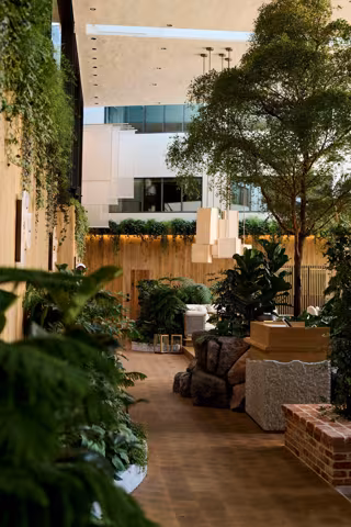 La transformación del antiguo Skt. Petri honra el patrimonio arquitectónico del edificio a la vez que introduce una sensibilidad natural. Los interiores presentan muebles daneses artesanales, iluminación escultural y texturas en capas que reflejan la belleza orgánica del paisaje nórdico. La exuberante vegetación se extiende por todo el espacio, desde los árboles que se alzan en el atrio hasta las terrazas enmarcadas con vegetación y los pequeños jardines, creando un ambiente vivo y característico del lugar.