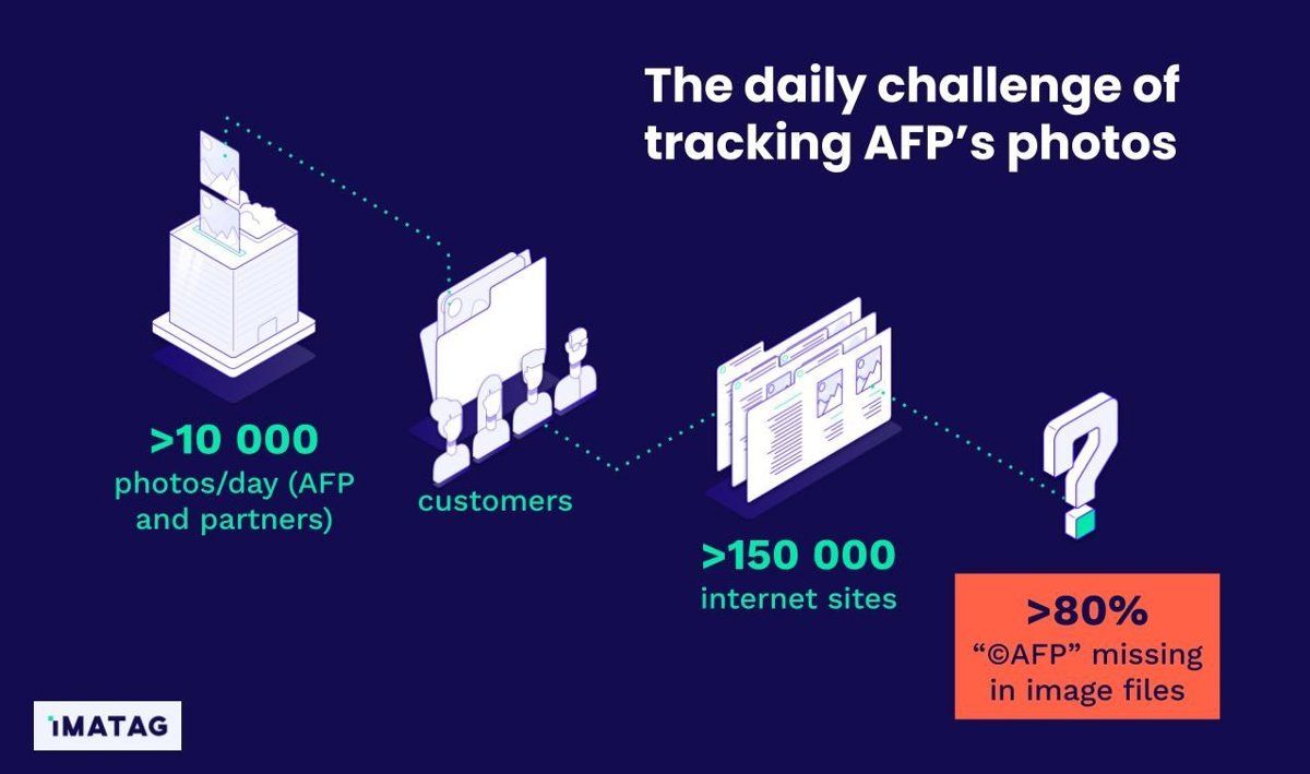 Después de buscar durante mucho tiempo una solución capaz de identificar automáticamente y sin errores sus propias fotos en la web y en la prensa, AFP optó por IMATAG, especialista en reconocimiento de contenidos visuales y marcas de agua invisibles.