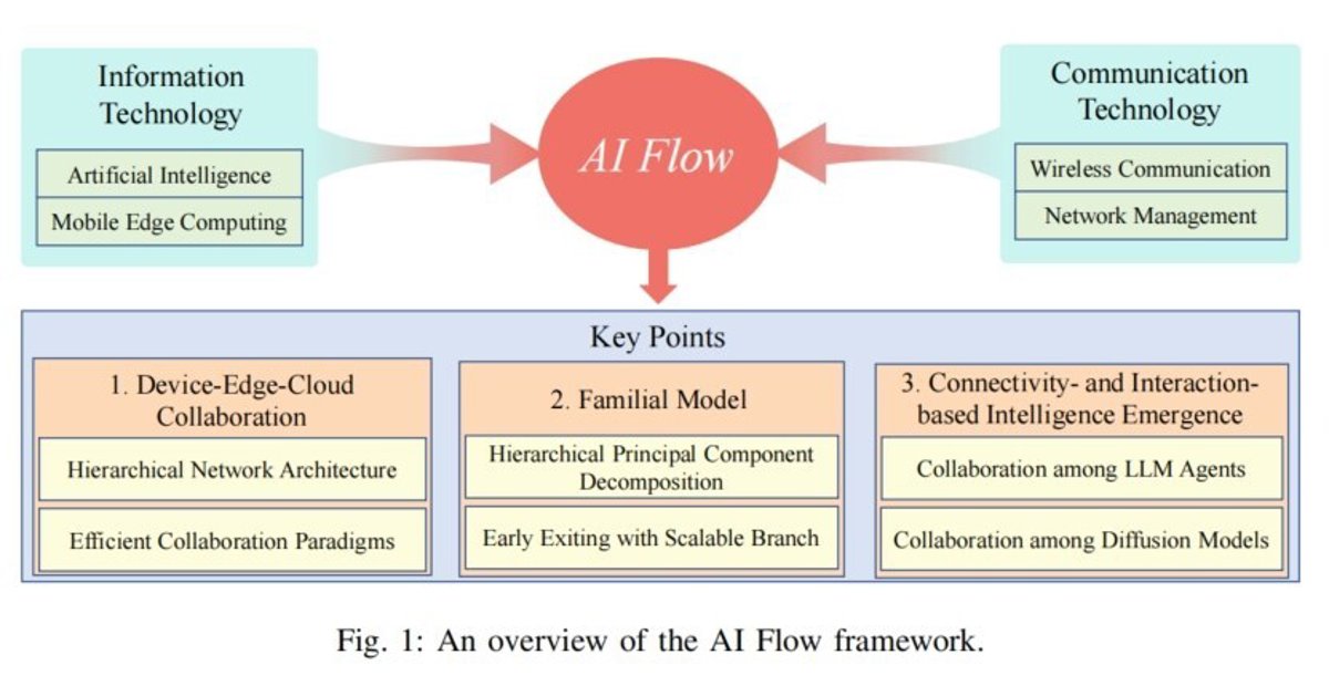 AI Flow, bajo el liderazgo del profesor Xuelong Li, director de tecnología y científico jefe de China Telecom y director de TeleAI, se presenta para abordar los importantes desafíos que plantea el despliegue de aplicaciones emergentes de IA debido a las limitaciones de recursos de hardware y las limitaciones de la red de comunicación, mejorando la escalabilidad, la capacidad de respuesta y la sostenibilidad de los sistemas de IA del mundo real. Se trata de un marco multidisciplinario diseñado para permitir la transmisión fluida y la aparición de inteligencia a través de arquitecturas de red jerárquicas, aprovechando las conexiones entre agentes y las interacciones entre personas. En esencia, AI Flow se centra en tres puntos clave: