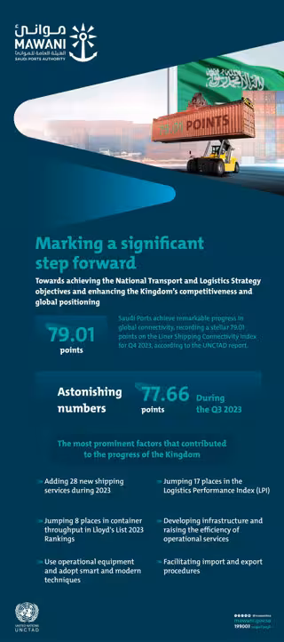 RIAD, Arabia Saudita, 14 de diciembre de 2023 /PRNewswire/ -- En un avance significativo que se alinea con los objetivos de la Estrategia Nacional de Transporte y Logística (NTLS), Arabia Saudita ha reforzado su competitividad y posición global. La Autoridad Portuaria de Arabia Saudita (Mawani) logró su mayor mejora en el Índice de Conectividad del Transporte Marítimo (LSCI) de la UNCTAD para el cuarto trimestre de 2023, obteniendo una puntuación notable de 79,01 puntos. Este logro se suma a los importantes récords recientes, incluida una puntuación de 77,66 durante el tercer trimestre.