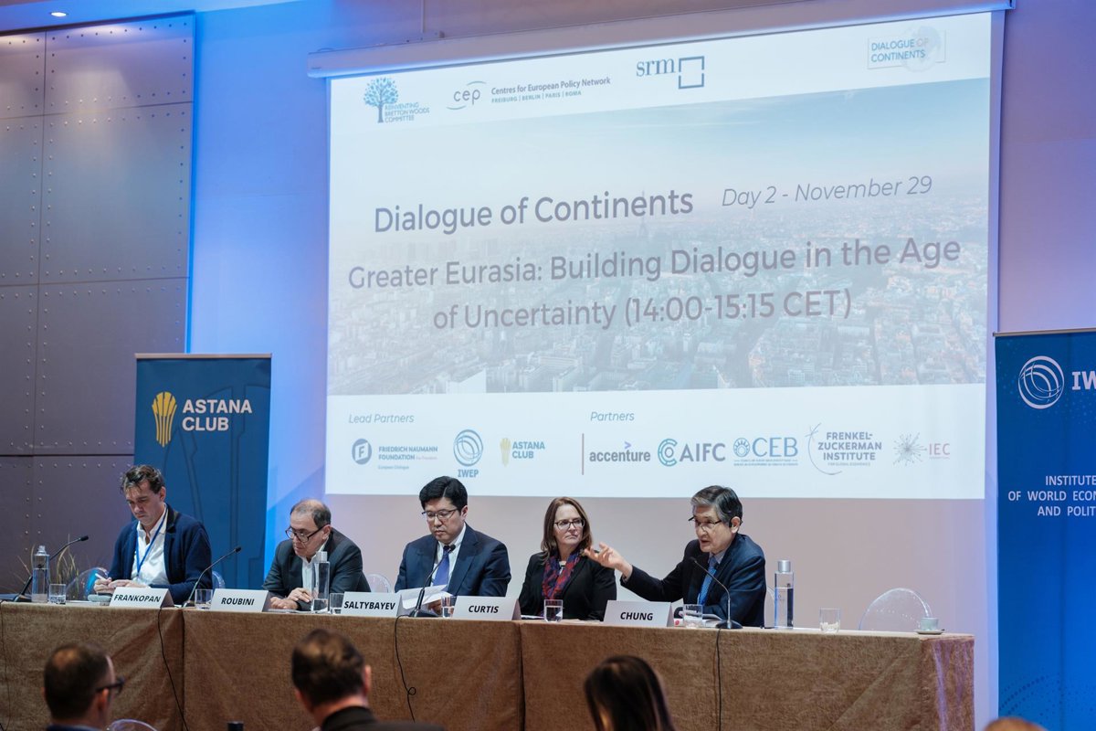 La sesión fue moderada por Yerzhan Saltybaev, director del Instituto de Economía y Política Mundial de Kazajistán, quien afirmó que "estamos asistiendo a la aparición de Eurasia como espacio económico único, y Asia Central y Kazajistán tienen un gran potencial para convertirse en un punto de encuentro del continente".