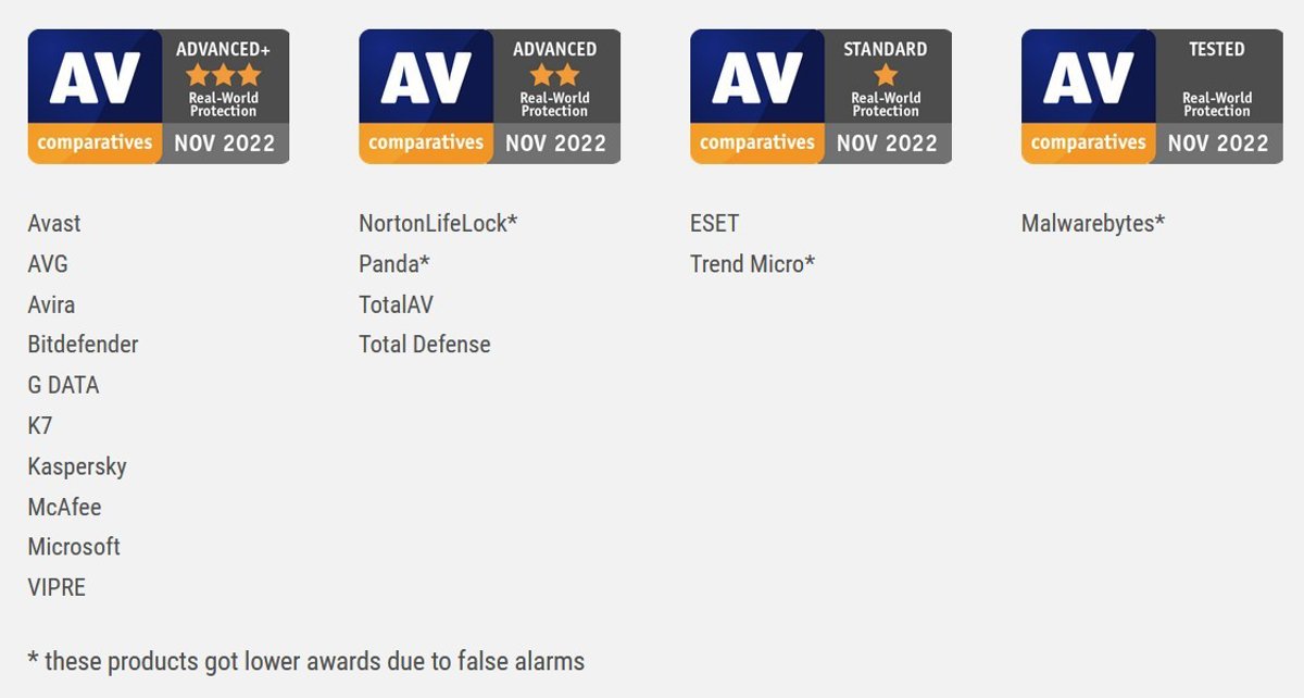 The products tested by AV-Comparatives were:Avast Free Antivirus, AVG Antivirus Free, Avira Prime, Bitdefender Internet Security, ESET Internet Security, G Data Total Security, K7 Total Security, Kaspersky Internet Security, Malwarebytes Premium, McAfee Total Protection, Microsoft Defender Antivirus, NortonLifeLock Norton 360 Deluxe, Panda Free Antivirus, TotalAV Antivirus Pro, Total Defense Essential Antivirus, Trend Micro Internet Security, and VIPRE Advanced Security.