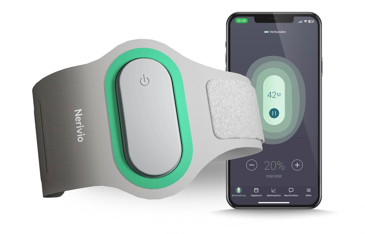 - Durante el tratamiento, Nerivio® se coloca en la parte superior del brazo y se controla mediante una aplicación móvil, por lo que resulta un dispositivo cómodo y portátil.