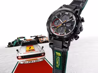 La esfera del reloj cuenta con un par de diales insertados inspirados en la forma icónica de las ruedas Igeta originales de TOM'S. Los diales insertados emplean la forma distintiva de los radios de esas ruedas, que parecían una marca afilada (#), en forma de silueta, lo que garantiza que pase mucha luz para alimentar el reloj. El patrón de panal en la posición de las 3 en punto, que presenta un diseño transparente que emplea una construcción de doble capa, está inspirado en la parrilla delantera del coche de carreras, con un tono púrpura subyacente que recuerda a la tapa de la culata del motor. El EFS-S641TMS, que rezuma pasión por el diseño hasta en los detalles más pequeños, captura verdaderamente el aspecto de la legendaria máquina de carreras que causó sensación en el mundo de los deportes de motor de la década de 1970, al tiempo que transmite la determinación de TOM'S de seguir compitiendo durante otros 50 años.