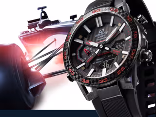 El SOSPENSIONE ECB-2000 es un cronógrafo de alto rendimiento que expresa una visión del mundo de los deportes de motor con un diseño de caja único inspirado en la suspensión de un coche de carreras de fórmula. Con un motivo inspirado en la suspensión de doble horquilla utilizada en los coches de carreras de fórmula con pares de brazos bifurcados superiores e inferiores, las orejetas que conectan las bandas a la caja están configuradas en una disposición de cuatro brazos. Por primera vez en un reloj EDIFICE, la caja está hecha con resina reforzada con fibra de carbono liviana y altamente duradera.