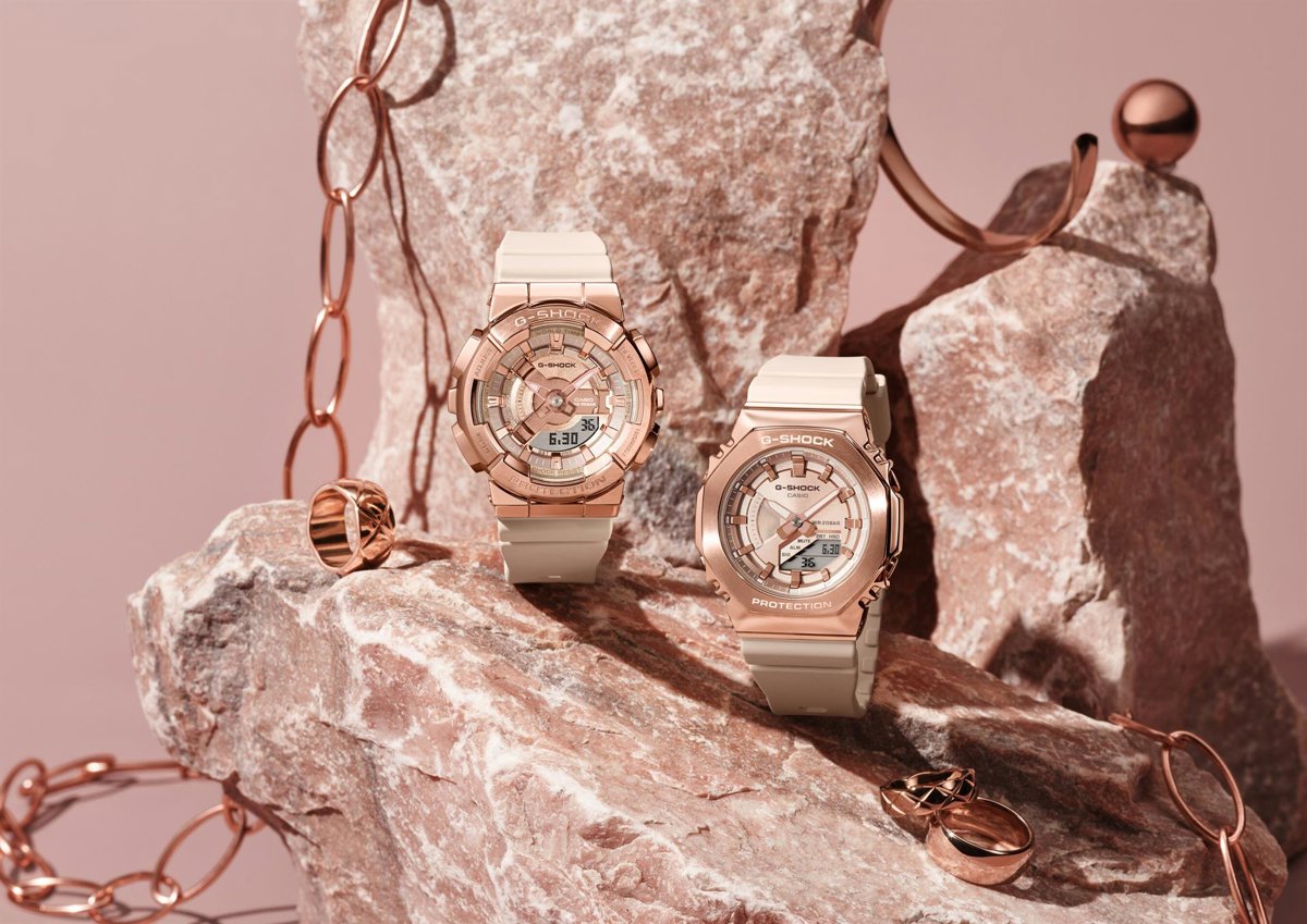 Los modelos GM-S110PG, GM-S2100PG y GMA-S2100MD resistentes a los golpes traen una esfera y caja de oro rosado brillante a las versiones más pequeñas y livianas del GA-110 con su esfera dimensional distintiva y el GA-2100 con su bisel octogonal, que ha demostrado ser especialmente popular entre los consumidores más jóvenes.