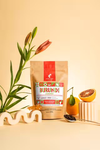 Procedente de la célebre estación de Gakenke, en la provincia burundesa de Kayanza, la variedad Red Bourbon, procesada de forma natural, se recolecta y selecciona a mano antes de secarla como cereza entera, lo que le confiere una vibrante fragancia floral, un rico dulzor y un sabor afrutado.